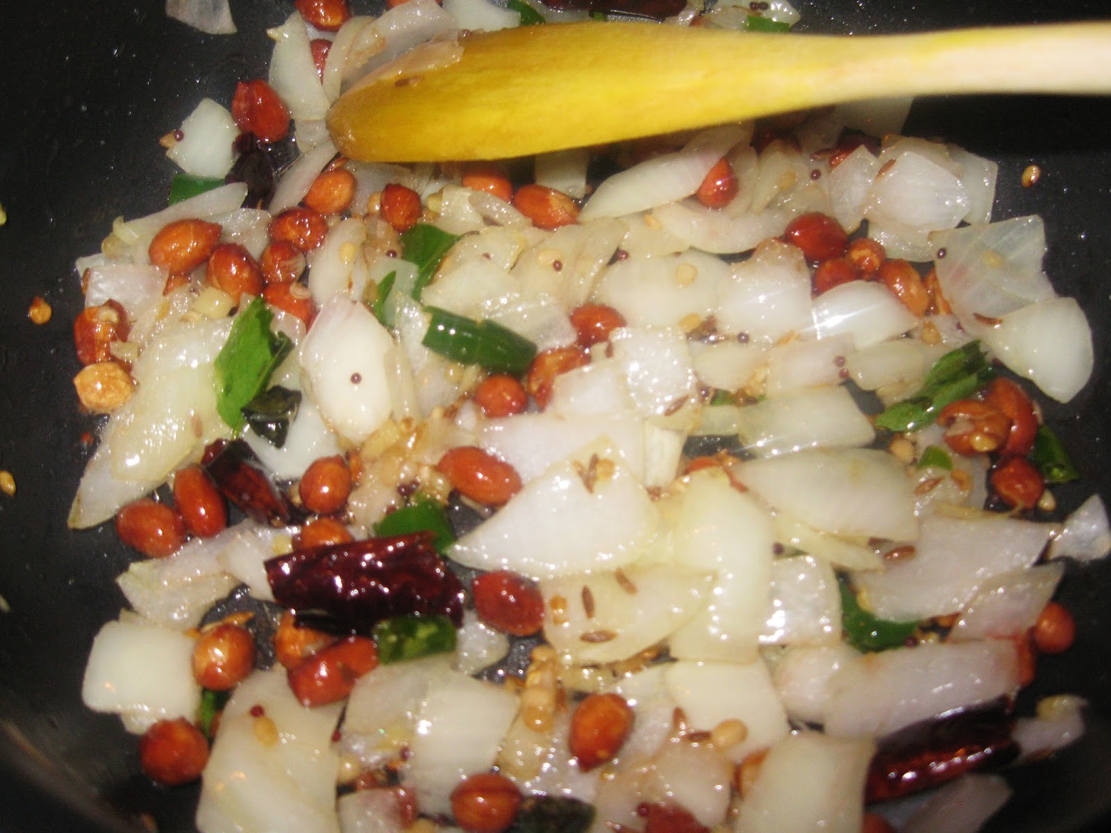 Add popu ingredients and once they splutter add green chilli, curry leaves, onions,ginger and turmeric